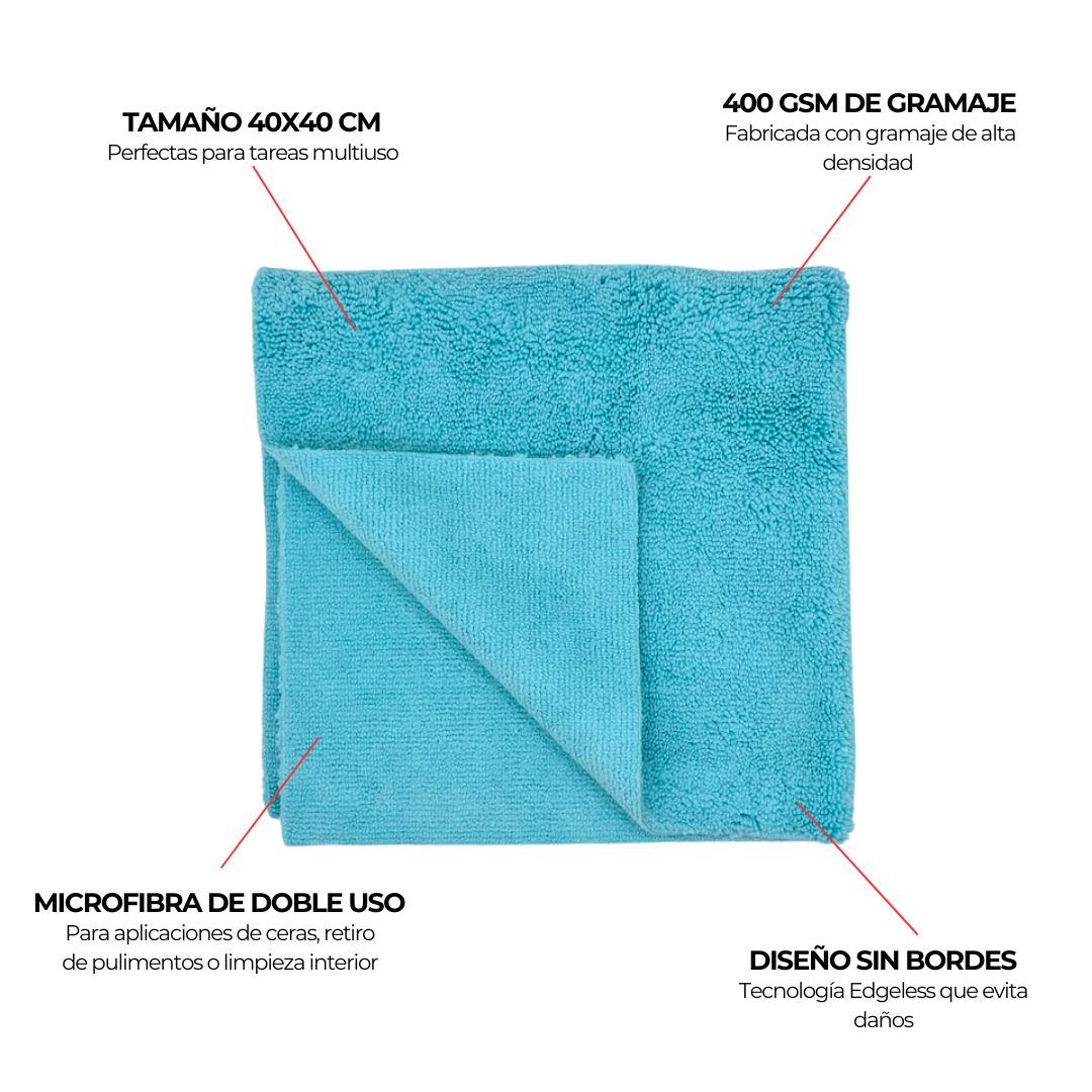 Paño de microfibra edgeless diseñados para tareas generales de detailing. Adecuado para combinar con productos en spray o pasta, o utilizarlos para retira residuos de pulimentos. El diseño sin borde ayuda a evitar daños involuntarios.